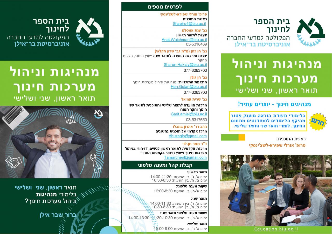 מטרות התוכנית התוכנית למנהיגות וניהול מערכות חינוך בפקולטה לחינוך היא תוכנית ייחודית, אשר באה לתת מענה לפיתוח דור העתיד של המורים בישראל, הן בחינוך הפורמלי והן בחינוך הבלתי פורמלי. פיתוח שדרת המנהיגות במערכת החינוך הישראלית היא אתגר לאומי ובינלאומי, כאחד. מנהיגי החינוך מובילים את בתי הספר להצלחה פדגוגית וערכית כאחד. הצלחה זו צריכה לבוא לידי ביטוי גם במסגרות חינוך תומכות כמו: החינוך הבלתי פורמלי, מחלקות חינוך ברשויות המקומיות, עמותות וארגוני חינוך שונים. התוכנית למנהיגות וניהול מערכות חינוך בפקולטה לחינוך של אוניברסיטת בר-אילן מובילה את טיפוח המנהיגות החינוכית במערכת החינוך לצד קידום המחקר האקדמי בתחום הניהול החינוכי והמדיניות החינוכית. התכנית למנהיגות ולניהול מערכות חינוך, המרצים והסגל המנהלי, הינם חלק ממשפחת הפקולטה לחינוך וכולם ביחד מהווים בית חם עם אווירה משפחתית ותומכת המסייעת לכל סטודנט להצליח ולשאוף גבוה. הצטרפו אלינו וביחד נוביל חינוך!